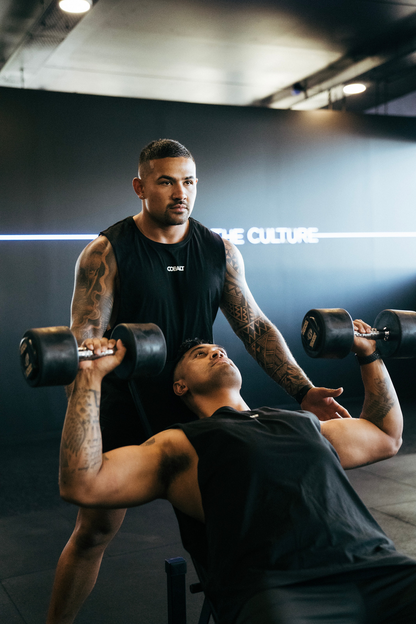 Something for the boys! The perfect training singlet, a classic muscle tank with drop sleeves and high neck. Featuring our cobalt logo in the centre.